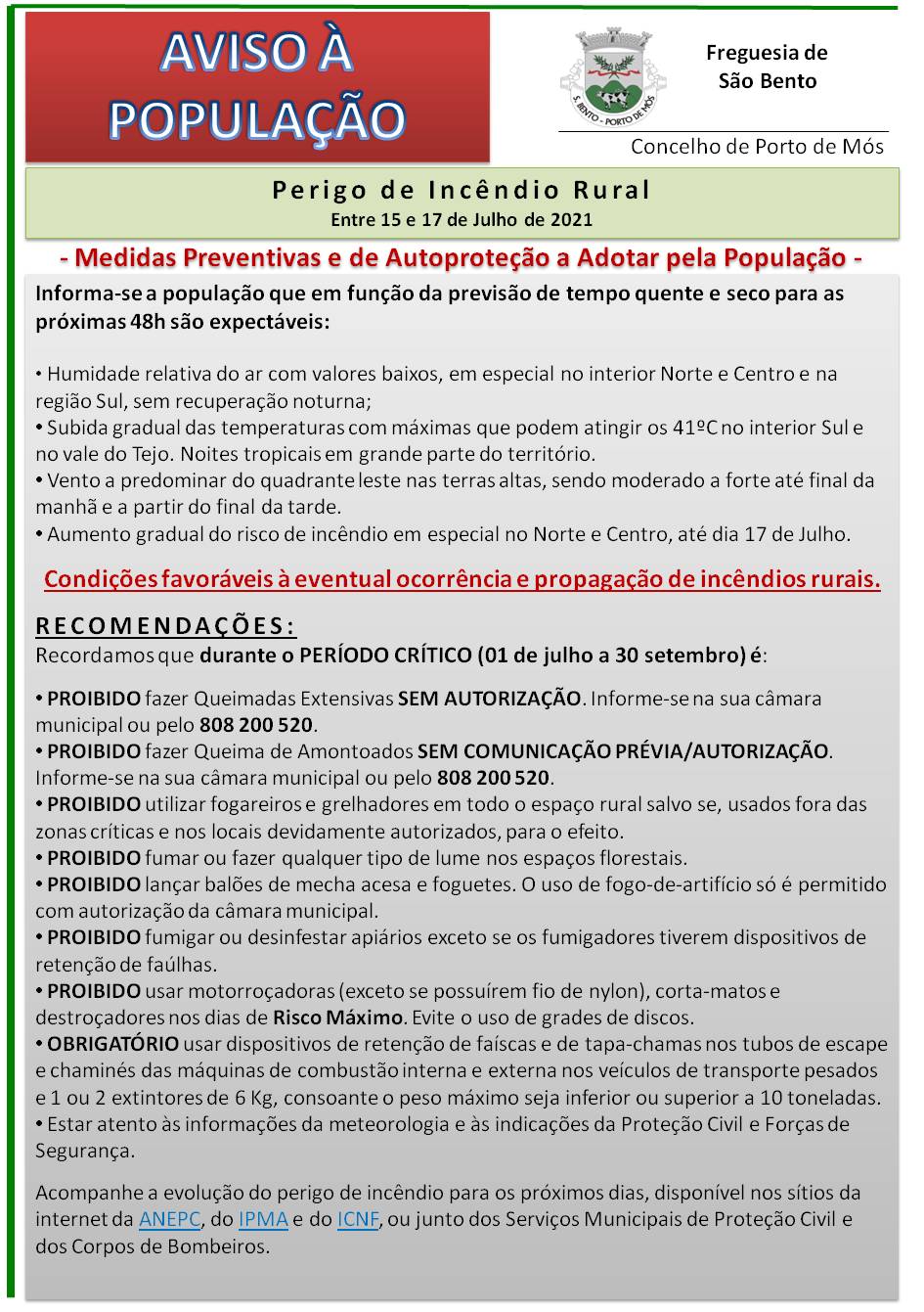 Perigo de Incêndio Rural - 15 a 17 julho