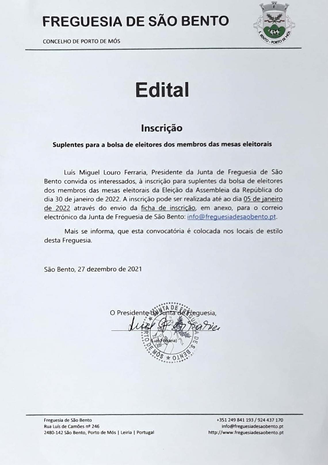 Encontram-se abertas as inscrições para a Bolsa de Agentes Eleitorais da Freguesia de São Bento. Pode enviar a sua inscrição até ao dia 05 de janeiro de 2022 para o email info@freguesiadesaobento.pt.