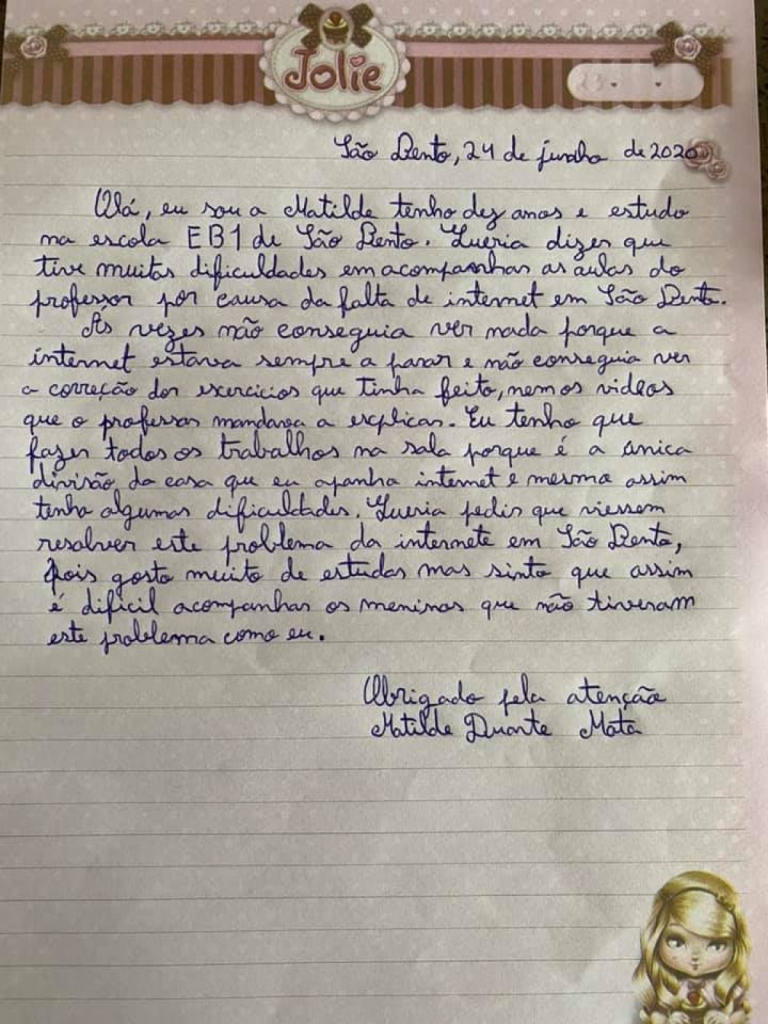As crianças e jovens que habitam nas freguesias da serra, do concelho de Porto de Mós, estão a escrever cartas endereçadas ao Presidente da República, Marcelo Rebelo de Sousa, relatando as dificuldades que têm no acesso ao ensino à distância, devido à ausência de telecomunicações e serviço de internet. A intenção é que todas as crianças e jovens elaborem uma carta deste género a relatar as dificuldades com a falta de internet. Cartas essas que devem ser entregues nas sedes das Juntas de Freguesia até sexta-feira, dia 26 de Junho, até às 15 horas.