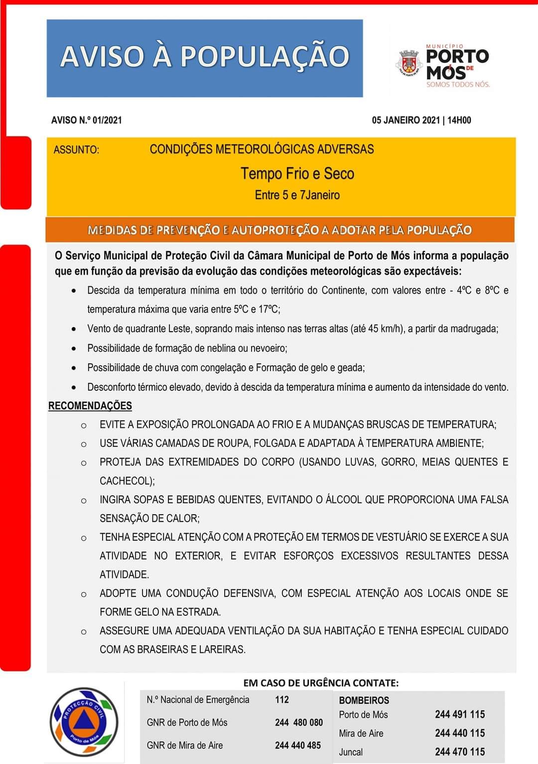 Aviso à População | Condições Meteorológicas Adversas | 05 a 07 Janeiro 2021
